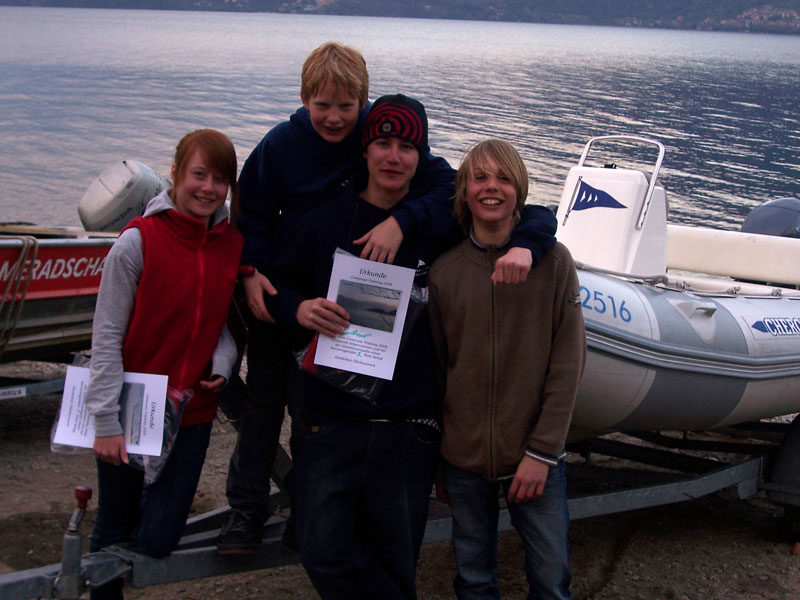 Torbole 2010 Sebastian, Hobbes und Domi wurden von Daniel Uhl zusammen mit den Radi-Seglern Christian, Max und Willi trainiert, es war absolute extraklasse! Viel Wind, öfters Sonne, warme Temperaturen waren der Rahmen. Mal frühes Auslaufen um 09.00 Uhr, dann wieder Licht ausmachen auf dem See um 17.30 Uhr, Theorie bis in die Nacht sowie Sporteinheiten verlangten unseren Seglern alles ab. Trainingsregatten mit 4.7 und Radi-Kader zeigten den hohen Leistungsstand der Gruppe. Torbole selbst war von den über 100 Booten aus BaWü gefüllt. Al Grotta mit lokalen Spezialitäten wie auch Al Porto und Il Centro standen auf dem Abendprogramm. Gerüchteweise verirrte sich diverses Begleitpersonal in örtliche Spelunken, die Segler waren abends so platt, dass sie wie ein Stein ins Bett fielen. Gardasee im Spätherbst war mal wieder die Reise absolut wert! |